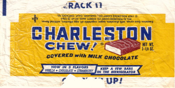 Charleston Chew was introduced in 1922, when the Charleston was a popular dance. Even I remember watching people doing the Charleston on our black-and-white television – which had two channels, Four and Seven, along with the educational Channel Two.
