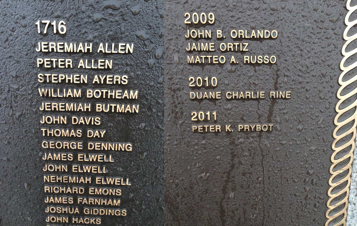 The statue, the man at the ship’s wheel, gazes intently toward the horizon. But he also keeps watch over his brothers – 5,368 Gloucestermen known to have died at sea – who are honored there. At his feet, on the semicircular wall that curves oceanward, are the plaques with the names. The first is Jeremiah Allen, deceased in 1716. The last is Peter Prybot, who perished in 2011. There is ample space below Peter’s name for additional honorees. And yes, it is only a matter of time before more names arrive.