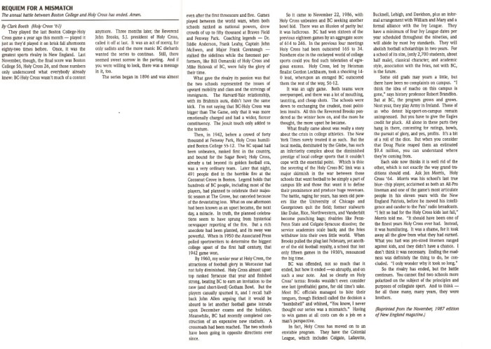 Clark was a Holy Cross man. Twenty-four years ago, I was editing a special Silver Anniversary edition of a publication for the BC Hall of Fame, and I called Clark and got his permission to reprint his magazine article about the BC-HC football rivalry. It’s worth a read, and it appears below. Ironically, the teams will begin playing each other in the 2018 season, after a hiatus of 32 years. I don’t know whether the games will be good or even competitive, but they certainly won’t be the same.