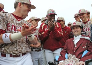 Pete receives his baseball jersey from members of the BC baseball team. The team has retired his #3.
