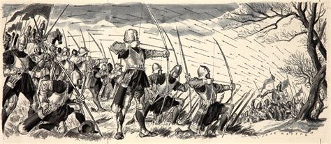 The ranks of knights broke up into ragged lines, and the English archers began to pick them off like snipers. It was impossible for the Frenchmen to mount a cavalry charge. The horses stumbled, floundered, and fell.